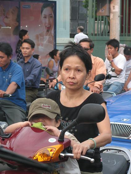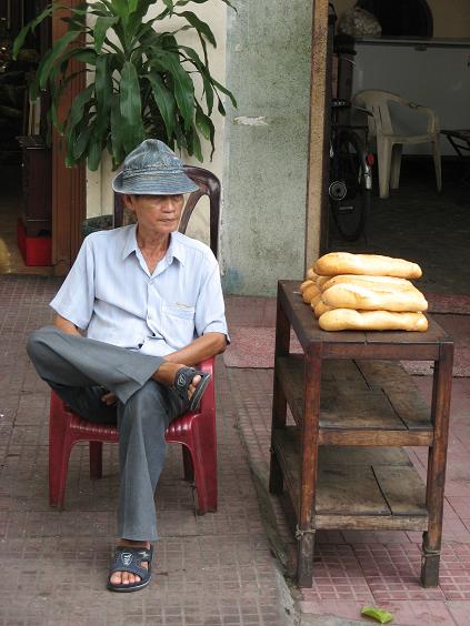 Today I booked a tour to visit two popular Ho Chi Minh City area sights: The Tay Ninh Holy See and The Cu Chi Tunnels. After an early breakfast at the hotel (same menu as yesterday), I had a few minutes to stroll the streets before meeting the tour bus. At 7:30AM, the streets of Saigon were already buzzing with assorted food and fruit hawkers. Here, a baguette vendor: