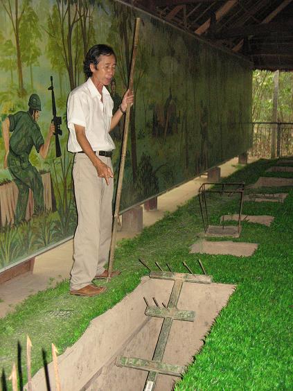 One of several exhibits of the rather barbaric traps used during the American war. The guerrilla fighters seem to have had a fondness for impaling (usually in pits, by metal spikes or sharpened bamboo sticks.) Informative, if touristy set-up. Other exhibits displayed a bombed out American tank and mannequins of uniformed guerrilla fighters in working/fighting poses.