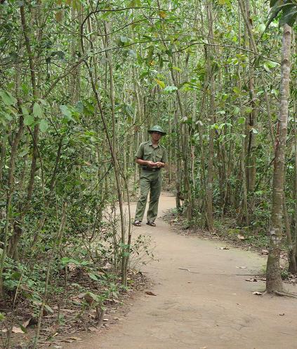 Young Cu Chi forest and guide. This area was completely defoliated by napalm in the 1960s and 1970s; trees only returned in the past couple of decades.