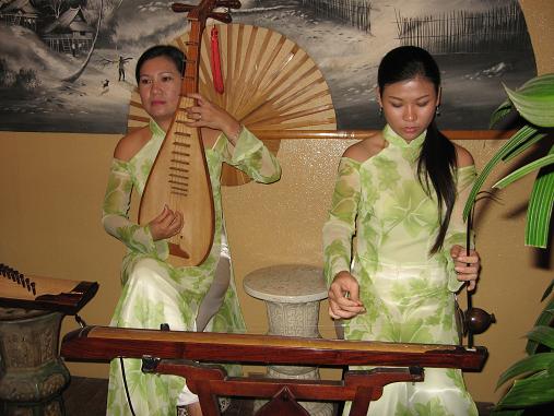 After a desperately-needed shower to wash off the Cu Chi clay, I set off for a civilized dinner at Vietnam House down the block from the hotel on Dong Khoi Street. The restaurant is located inside a restored three-story French colonial home and features staff in traditional Vietnamese dress and live music performances on pipa and zheng: