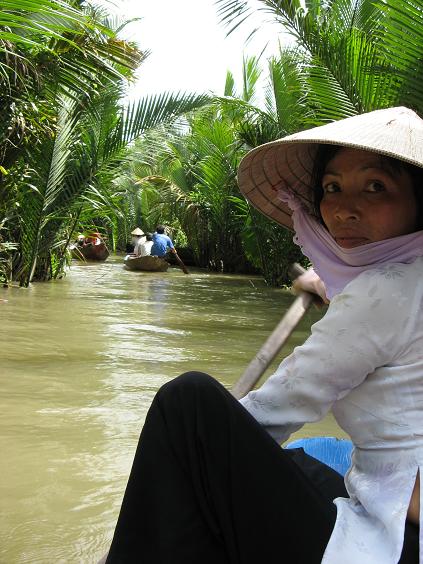 After the islands tour, I made my way to Ben Tre province. The system of canals is very narrow in segments, though, and motorized boats are not permitted through the coconut grove-lined water passages. Had to hire a rowboat, most of which seemed to be driven by petite local women. Looks are deceiving, though, and in pairs, these women impressively navigate their boats packed with hefty tourists through the twists and turns without hardly breaking a sweat. Quite a feat… I was drenched in perspiration and all I had to do was sit quietly (and snap these photos):