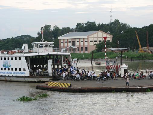 To Vinh Long. The large ferry transports passengers, cars, vans, and lots of motorbikes.