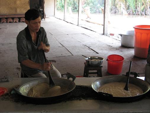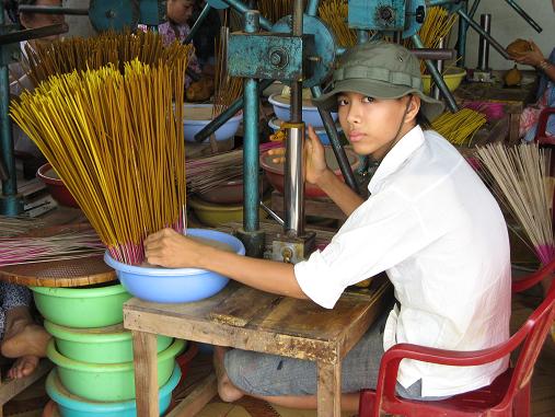 Mekong delta workers. At the incense factory, a half dozen employees sit in a stifling hot room and grind scented paste, which they then feed into the machines that stamp the incense onto the delicate sticks one by one, thousands of times a day. I would have thought that this entire process could have been mechanized entirely somehow, but apparently labor is inexpensive in Vietnam.
