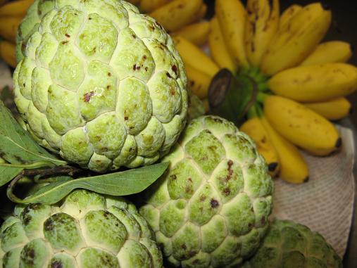Custard apples — the Southeast Asian version of the cherimoya, though by some accounts, not quite as tasty. As I only know of one person who has sampled that fabled Andean fruit, I may have to try to smuggle one of these back to her for a taste comparison.