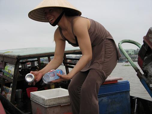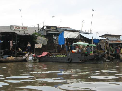 Just as we arrived at the outer edges of Phong Dien floating market, about 12 miles southwest of the city center, the rain began… first as slight drizzle and within minutes, a downpour. The boat operator barely got the tarp up in time for us to avoid a soaking. Vendors scrambled for cover.
