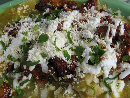I was seated at a window table, and after perusing the offerings, I decided upon the first item on the lunch menu: the chilaquiles – con carne enchilada (spicy pork) and green tomatillo salsa. No drinks were listed, so when I asked the friendly waiter for a recommendation, he suggested the “horchata.” Not knowing what that was, I tried to ask – en español – about the ingredients; instead he offered to bring by a sample of the iced, creamy-looking white concoction.