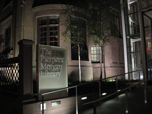 The Morgan Library (now the Morgan Library and Museum ) reopened in late April 2006 after a three year renovation and expansion during which the exhibition spaces were doubled by the construction of Renzo Piano’s four-story, steel and glass atrium. We visited during Friday’s late evening hours, after a round of beers (Harp and Magic Hat #9, not Kiuchi Nest) at nearby Ginger Man.