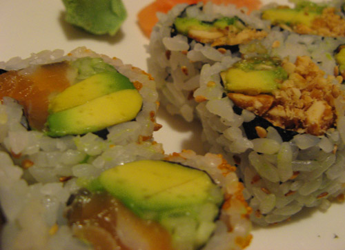 I only recently discovered Tenzan, a casual sushi restaurant on Columbus Avenue, after dinner with CS one night shortly after she moved into the neighborhood. As local joints go, it’s been reliably tasty: the fish is always fresh and they excel in what chowhound Jim Leff affectionately calls “Stupid Pandering Americanized Sushi,” which is to say, “double dragon rolls, spicy tuna, lots of crispy and spicy thingamabobs.” Sometimes I crave the stuff, too – my apologies if that offends the sushi purists among you. Of late, I’ve been enjoying Tenzan’s “Spicy like roll” (don’t ask me what that means): an enticing combination of chopped shrimp, tobiko and crunchy bits. B accompanied me there before our night of liquor tastings; he opted for a couple of the more familiar rolls, and one creamy and curiously sweet peanut/avocado roll.