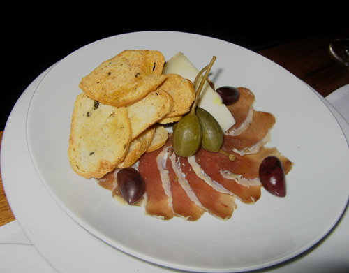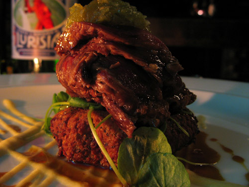 Grilled Kangaroo on a coriander falafel with lemon tahini sauce and green pepper relish — compliments of the chef. Never had kangaroo before — grilled or otherwise. It doesn’t taste like chicken… more like a rare steak. I was expecting a tougher, gamier meat, but it was mild, juicy and very tender.