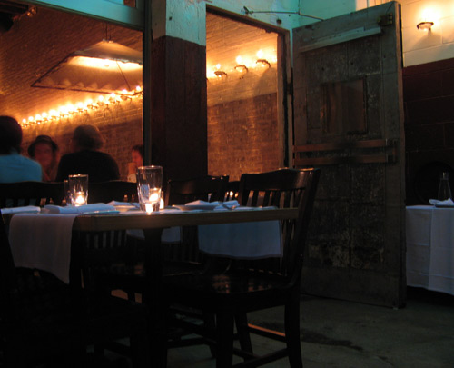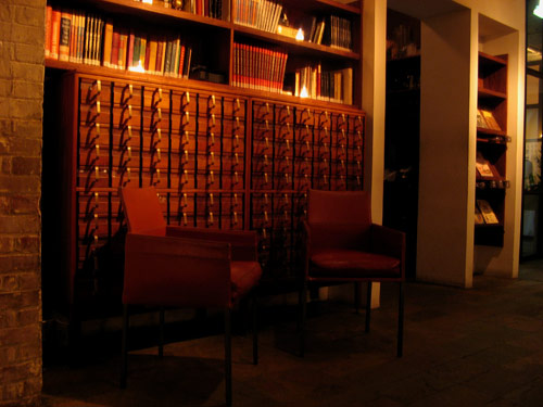 Public Restaurant inhabits the NoLIta space formerly occupied by a muffin factory. The redesign concept was overseen entirely by hot, interior design and architecture firm AvroKO, earning them an unprecedented sweep of the Outstanding Design and Outstanding Graphic categories at the James Beard Awards in 2004. The restaurant uses salvaged pieces from municipal buildings of the 1930s to the 1950s: bronze post-office boxes, oak and rippled glass restroom doors with mail slots, vintage library-card catalogues, and wooden clipboarded menus made from standard-issue government forms.