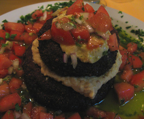 Times reviewer Eric Asimov pronounced, “There may be no better hummus in town than Tanoreen’s smooth and airy version, just touched with lemon juice and garlic, perfect with the crisp house-made zatar bread.” SK mentioned investigating this claim last week, and finding their hummus a little runny, but ours was thick (but not overly so) and brightly flavored, and well accompanied by the crisp breads, thickly brushed with zesty, herby paste.
