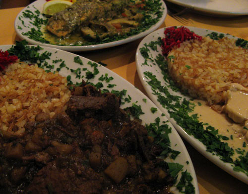 We devoured the meze and awaited our entrees, which soon arrived all at once: the “Kafta” (ground spiced lamb, topped with tahini sauce), the wonderful, tender spicy beef and the moist, garlicky, herb-coated salmon. All came with a heavy sprinkling of fresh parsley and were served with what the server called “Egyptian rice”: a spiced, textured rice mixture interspersed with thin brown noodles. So good!
