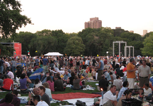 After dropping off our CSA share after work (more eggplant and peppers!), we were off to enjoy one of the great NYC summer traditions: The Metropolitan Opera Parks Concerts. A cool and clear night for La Traviata, but wow, there were a lot of people on the Great Lawn. The Met officials later reported the police estimated attendance of 30,760 – which seems to me an impossibly specific number. That’s a full third fewer than five years ago (which is contrary to what I would have guessed) when 45,000 people showed up for the performance, but well off the 1990 nadir when, due to a combination of factors (rain date, early start), fewer than 500 were counted in attendance for the opening notes.