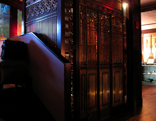 Here, the repurposed elevator bank — now wine storage: