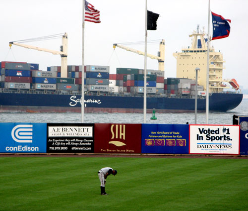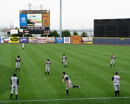 After a flash rainstorm earlier in the day put our plans in jeopardy, it ended up to be cool, clear night for minor league baseball. Tonight the Staten Island Yankees were playing the Hudson Valley Renegades at the Ballpark at St. George Station (now: Richmond County Bank Ballpark.) The stadium, located just steps from the ferry terminal, was designed by HOK Sport — the same architectural firm that designed Oriole Park at Camden Yards and Jacobs Field. The ballpark seats 6,886 for baseball, and offers stunning views of the lower Manhattan skyline and the river traffic just beyond the outfield wall.