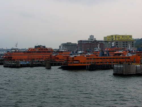 At precisely 6:15PM, we hopped the “John F. Kennedy” Ferry to St. George, one of the two Kennedy Class boats still in operation. (We took the other, the Governor Herbert H. Lehman, on the return to Manhattan.) These four-engined boats were the first diesel-powered ferries to enter the fleet, in 1965. [That’s for you, HYB.] The boats have a capacity of 3,500 passengers and up to 40 vehicles – though due to security concerns, cars haven’t been permitted aboard since 2001. Since 2005, the Ferry has added three larger, more powerful Molinari Class boats to the fleet (pictured below in the St. George Terminal): the Guy V. Molinari, the Sen. John J. Marchi, and the Spirit of America (which originally was to be named “The September 11th.” Wise choice.)