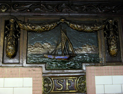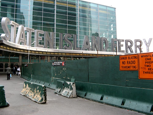 Today, of course, it’s the entry point for the Staten Island Ferry. After racing through an early dinner at Thai Son with J in Chinatown, I met SYB, HYB and AB there, I hadn’t been on the Ferry in years, certainly not since the $201 million Whitehall Terminal opened in February 2005, about $50 million over budget. Construction began in late 2000 and was slated for completion in 2003, but financial and legal troubles (including subcontractor charges of bribery) may have contributed to the two-year opening delay. The space was designed by Schwartz Architects, the New York City firm that was unanimously selected for the project from an international design competition held in 1992. At about 19,000 square feet, the new terminal is approximately twice the size of the original, and features five new escalators and a 75-foot-tall, glass-enclosed entry hall with panoramic views of the downtown Manhattan skyline and waterfront. For the first time, the connection to the IRT South Ferry subway entrance is now directly inside the ferry terminal. The Whitehall/BMT subway entrance remains across the street, but eventually will connect once the renovations are complete.