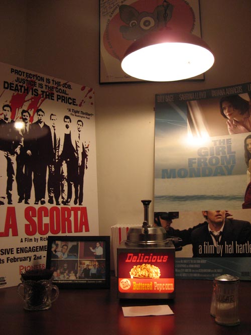 Later in the evening, B stopped by (with a bottle of cachaça — thanks!) and we took the subway downtown to Two Boots Pioneer Pizza for the premiere of Blogumentary — a lightweight documentary about the influence of web logs on media, politics and culture. Yep: it’s a film about bloggers blogging! The theatre was less than half full, despite the promoted appearance of the filmmaker, Chuck Olsen. Perhaps the relevance of blogs has been overhyped — another case of the vocal (or prolific) few generating disproportionate coverage and skewing general perception.