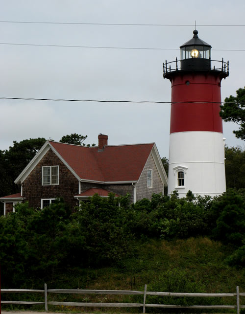 After a breakfast at Hearth ‘n Kettle — or “H ‘n K,” as I see them refer to themselves on occasion — we set out for a leisurely drive up Route 6 to Provincetown. On the way we made several stops to visit the old familiar sights (and a couple of yard sales.) Here, the iconic Nauset Lighthouse (and adjacent privately owned lightkeeper’s house) in Eastham, instantly recognizable from its countless postcards, calendars and potato chip bags. This 48-foot cast iron structure was built in 1877 and painted its distinctive red and white in 1940. The lighthouse was originally set in Chatham, high on a cliff over Nauset Beach, but steady erosion forced its move farther inland in 1923, where it replaced the last remaining of “The Three Sisters” lights at the Nauset Light Station. By the early 1990s, the lighhouse was in danger of falling into the sea yet again after decades more of erosion brought the coastline precariously close to its edge. After a groundwell of public support formed to preserve the structure, the Nauset Lighthouse was relocated over two days in November 1996 to the site 200 feet from the cliff edge, where it sits today. At the time of the move, just 35 feet separated the lighthouse from the water.