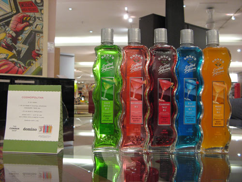 One of the party sponsors was Rose’s Cocktail Infusions: purveyors of multi-colored fruit-flavored drink mixers. After Rubell’s segment, a bartender came up front to demonstrate the recipes a couple of prettily-hued specialty drinks featuring Rose’s mixer, both of which were also being served up at the bar stations around the floor.