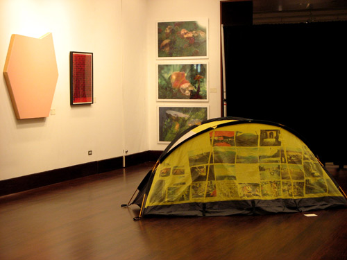 Here, Rikrit Tiravanija’s silkscreened tent, titled Atlas (a seeming bargain at $5,000-7,000 – and you can sleep in it.) On the left wall, in peach, Imi Knoebel’s Siebeneck (Seven Corners) — enamel on shaped panel, valued at $20,000-$30,000.
