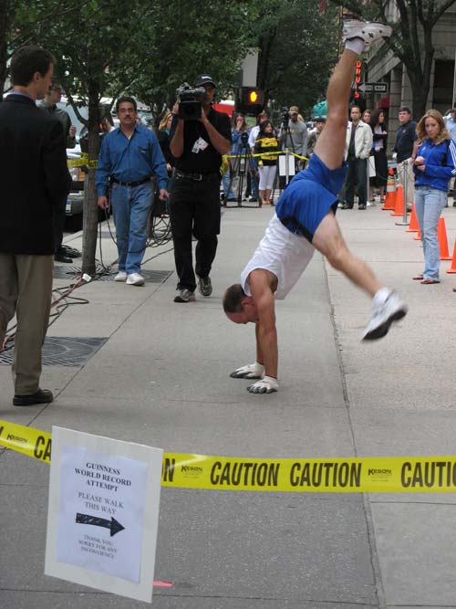 This morning, on Columbus Avenue, Don Claps from Brighton, Colorado, attempted to defend his Guinness World Record for “Most Cartwheels in One Hour” (currently, a dizzying 1,076. Personally, I don’t think I would ever want to attempt that many cartwheels over my entire lifetime, much less one every 3.35 seconds over an hour. But to each his own.) Ashton Kutcher and the Barenaked Ladies also dropped by.