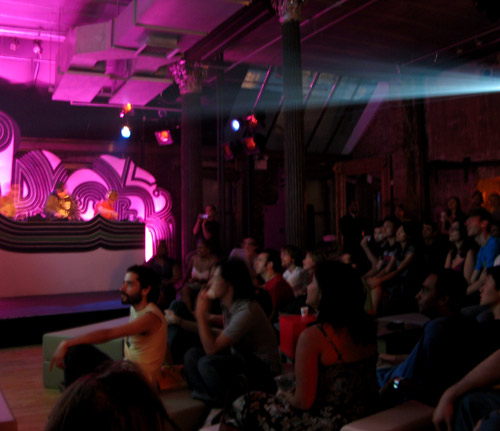 Back to the Starbucks Salon for the final show of the ten-day event. Eclectic Method is a trio of DVJs who mix audio and video by blending together music videos and film footage to a mash-up soundtrack, using mixers, DVD turntables, laptop computers and video projectors. For tonight’s performance, they culled material from Madonna, the Jackson Five, The Red Hot Chili Peppers, Stevie Wonder, Beyonce, Wu Tang Clan, The Bangles, Jimi Hendrix, The Triplets of Belleville, the Oompa Loompa song, Outkast, The Beatles…
