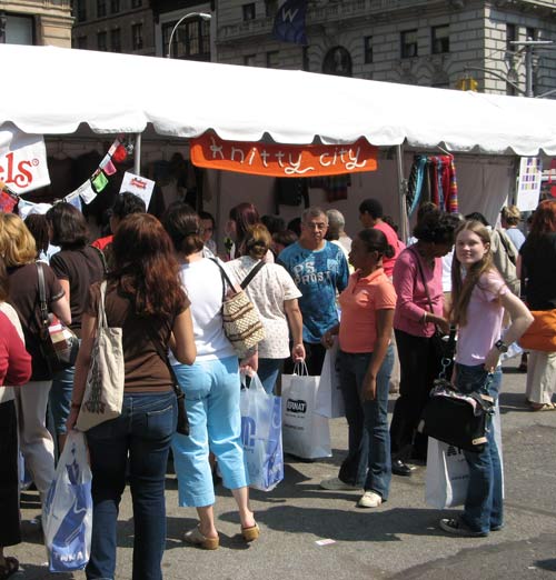 Brunch downtown at Chat ‘n’ Chew with SYB, after which, en route to Time Out New York’s “Back to School Blowout” in Union Square, we passed through stand after stand piled high with skeins of colorful yarns and impressive displays of fiber crafts. And lots and lots of squealing women, many lugging around overstuffed shopping bags, along with the occasional shellshocked-looking man – all out for the Eighth Annual “Knit-Out & Crochet” event, also being held that afternoon in the Park.