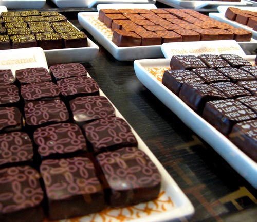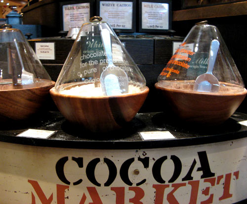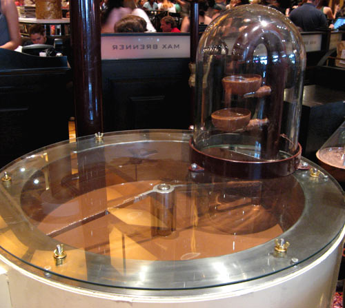 Popped into Max Brenner Chocolate by the Bald Man — the newish cafe/ restaurant/chocolate shop from Israel that opened its first New York City branch off Union Square, drawing crazy, sweet-seeking crowds, and inevitable comparisons to Willy Wonka (minus the Oompa Loompas.) From the moment we set foot inside the door, the rich, heady scent of chocolate permeated our nostrils. And no wonder: there were trays, plates, bins and fountains overflowing with the dark stuff at every turn. It was almost too much. Almost.