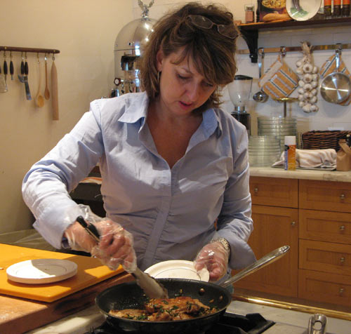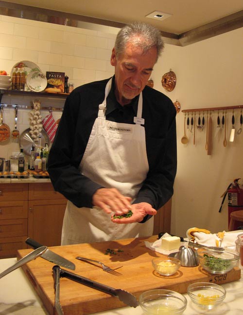 I got up bright and early on Sunday morning for my sautéing techniques class at Williams-Sonoma at the Shops at Columbus Circle. The class was the first I attended in the shop’s Sunday morning cooking series. I figured that although I already pretty much knew how to sauté, a more formalized instruction couldn’t but help. John, the instructor, explained a bit about the origins of sauté (from the French sauter, which means “to jump”) and the smoke points of different oils. As he talked us through a preparation of chicken with lemon-basil sauce, he offered some practical advice for successful sautéing: gradually heating the pan before adding the fat, not overcrowding the bottom of the pan, and ensuring all the pieces are generally the same thickness and size.