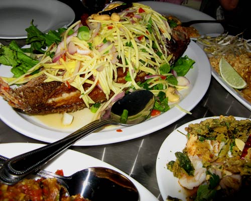 The pork was richly fatty and crispy as advertised, with shreds of bright basil and flecks of vibrantly red chile. Wonderful! And the whole fried red snapper with green mango salad: crispy, tender and moist all at once, with a delicately seasoned topping of shredded fruit, just spicy enough to give a kick – though not as incendiary as the drunken noodles or the crispy pork. Oh my.