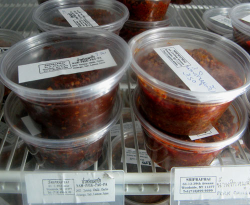 On the way out, we could not pass up the refrigerated case filled with glorious Thai desserts: coconut and pumpkin custard squares, banana sticky rice, delicate marzipans. And a dazzling array of Thai pastes and preserves (most with helpful English labels.)