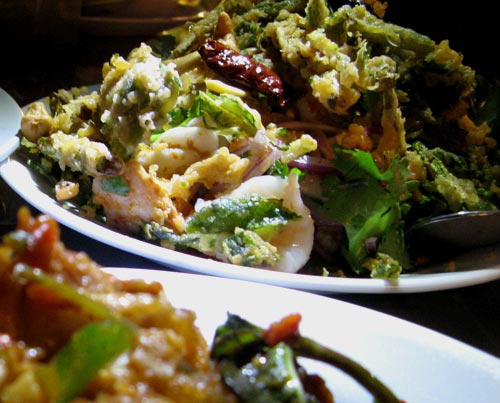 The salad – a pile of crisp, lightly battered, fried watercress, with cilantro, red onion, cashews, chicken, squid and shrimp, bathed in a refreshing chile, lime, fish sauce and sugar combination. Whole red chiles, and long strips of green chiles, which were dangerously difficult to distinguish from the watercress in the dim light of the garden. (Disaster and tears were narrowly avoided at the last moment.)