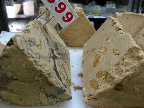 Just try. Sweetly clumsy compliment aside, I was taken in. I smiled my acquiescence and he chiseled off a generously-sized dense sample, studded with pistachios. I cautiously bit off a piece of the crumbly, flaky chunk: very sweet, nutty and powdery all at once. Not bad. I nodded approval, and the man explained that halva is a Middle Eastern confection, made of tahini, which is pressed into blocks with various sweet and seed-y/nutty ingredients and flavorings. The word itself comes from the Arabic root hulw, meaning “sweet.”