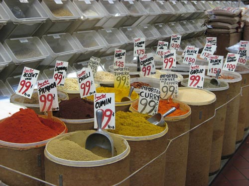 I was drawn in by the colorful bins of heady-scented spices up front at the International Market at 40th Street. Cumin, paprika, curry, chili and tumeric — all for just under $4 a pound? I’ve always been a Fairway-devotee, but this was tempting. There were counter displays full of juicy olives and intriguing prepared foods (I recognized the baklava), and a cold case in which sat a plastic bucket of… octopus? I spent an inordinate amount of time wandering up and down the (two) aisles, inspecting the shelves stocked with exotic dry goods, much to the bemusement of the three men behind the counter. I finally picked up a glass bottle of rosewater — maybe for tea or lemonade, or perhaps for baking… who knows?