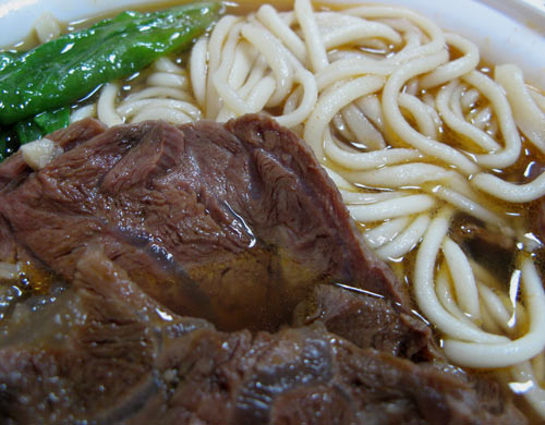 I didn’t get a shot of these sublime noodles the last time we were here, swimming in their disposable-quality white plastic bowls, under the just-too-bright flourescent lights. The restaurant still hasn’t replaced any of the English language signs; the wall-mounted red and yellow menu is still exclusively in Chinese, with the lone exception of the words “Hot & Spicy,” accompanied by a graphic of a chile pepper… instantly recognizable by anyone who hasĀ ever picked up a Chinese takeout menu. The symbol distinguishes Item #2, formerly known as “Hand-pull Noodle w. Beef in Hot & Spicy Soup.”