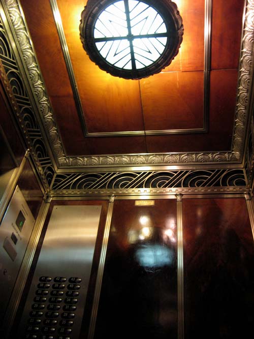 All of the building’s 32 elevators are lined in a different pattern of wood marquetry, using eight varieties of wood from four continents.