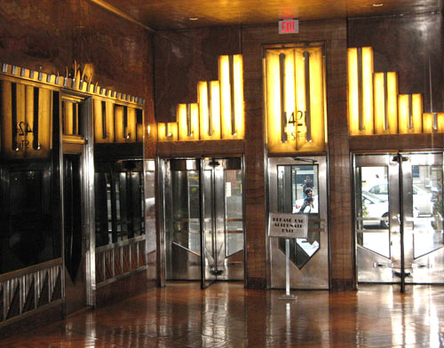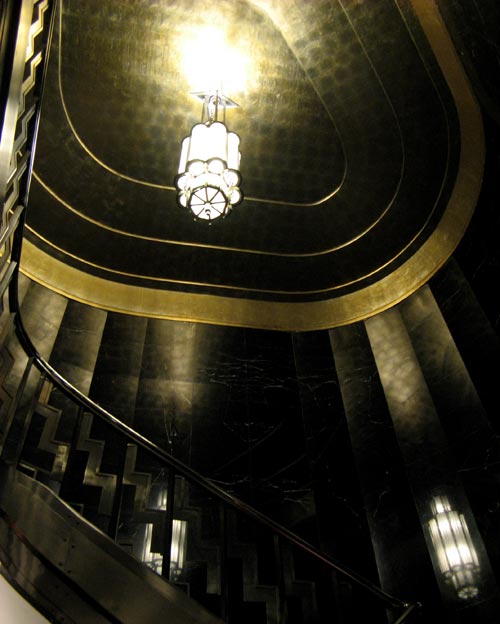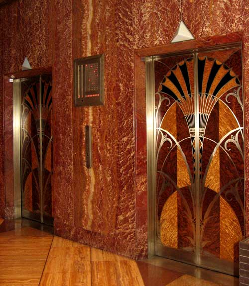 The building no longer maintains a public viewing gallery on the 71st floor, but we were allowed to wander around the stunning 3-story triangular Art Deco lobby with its lavishly decorated with polished Red Moroccan marble walls and multi-hued marble, travertine and onyx floors.