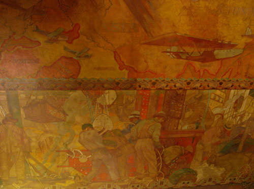 Detail of the elaborate ceiling mural, “Energy, Result, Workmanship and Transportation,” painted by Edward Trumbull. At some 70 by 100 feet, it was the largest in the world upon its completion.