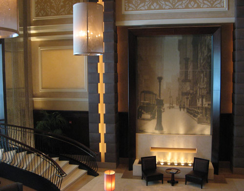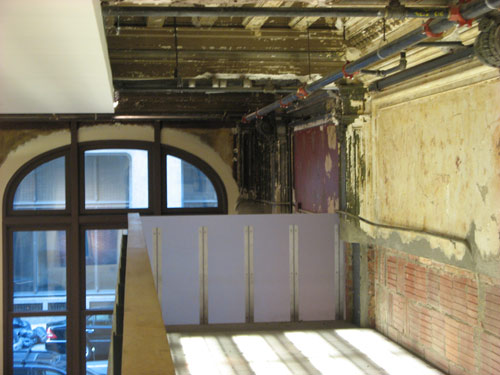 Students from Parsons designed and built the entry foyer and gallery space in what had been the Prince George Hotel’s “Hunt Room.” The result: the modern and airy World Monuments Fund Gallery at the Prince George, currently exhibiting “In Katrina’s Wake: Restoring a Sense of Place. Photographs by Stephen Wilkes.” The Gallery’s sleekly minimalist design highlights the building’s architectural past — and in fact: one upper section was purposely left raw and unfinished, as a reminder of the lobby’s original state.