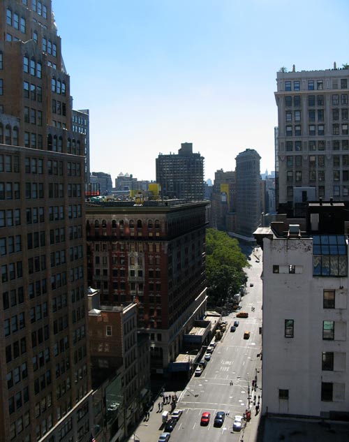 The view down Fifth Avenue to the triangular Fuller Building, better known as the Flatiron Building.