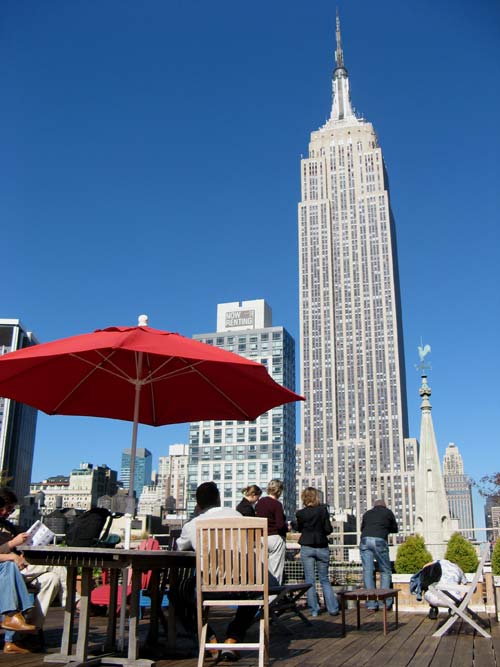 Up on the roof on this brilliant early Autumn afternoon. This deck was recently used in the filming of both “Spiderman 2” and “13 Going on 30,” for which Sony built a full set with bandstand and dance floor to create the prom scene. (Didn’t see the movie; I read that on the studio site.)