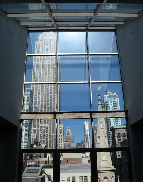 Here, the dramatic glass walled entry: that is, of course, the Empire State Building, looming large, on the left.