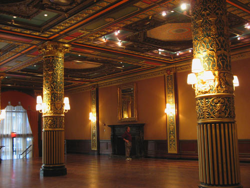 The jewel of the restoration is the 5,000 square foot Prince George Ballroom. Rich with intricate neo-Renaissance gilded plasterwork, elaborately muraled and ornamented 18-foot coffered ceilings, herringbone oak floors, and a striking black marble mantle.