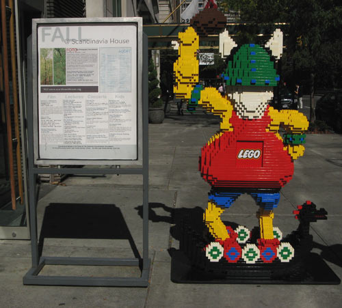 More openhousenewyork weekend fun. In front of the Scandinavia House, headquarters of The American-Scandinavian Foundation, an American non-profit organization that works to build cultural and educational ties between the United States and the five Nordic countries. (Psst… the fifth is Iceland.) Out front: a hilarious LEGO Viking, wielding a drumstick! (Maybe from a street fair.)
