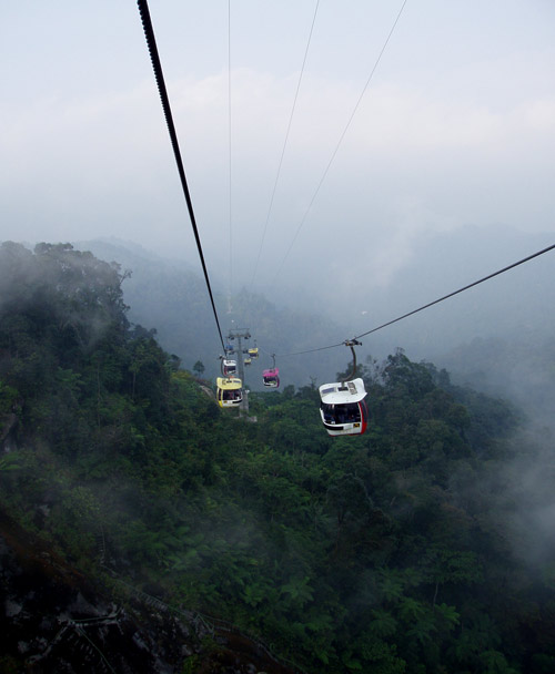 Bonus photo feature: a shot I took as I was riding the skyway for which the restaurant is named. Back in late 2004, I rode those very cable cars, up… up… up… the steep, misty mountains to Genting, City of Entertainment. The system has been described as the “fastest in the world and longest in Southeast Asia”: the 2.1 mile journey takes just 11 minutes… interspersed, for me anyway, with 20-30 second intervals of sheer terror as the cars would creak and swing precariously over every pylon. But what a view!