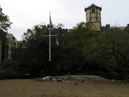 Directly across from the 181st Street subway entrance is Bennett Park, where George Washington set up his base of operations during the Revolutionary War. It was here at Fort Washington that American forces lost the decisive battle of New York on November 16, 1776 to British and Hessian soldiers. The rock outcropping of Manhattan schist in the photo is the highest natural point in Manhattan, 265 feet above sea level.