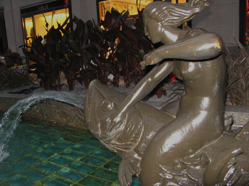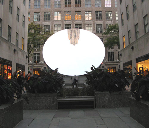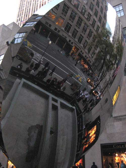 B hadn’t yet seen Anish Kapoor’s Sky Mirror at Rockefeller Center — which I checked out briefly during openhousenewyork weekend — and we were unsure about whether it was still on view. As it happened, the mirror was scheduled to be taken down on October 27, two days earlier, but dismantling a 23-ton circular stainless steel sculpture takes some time, so we were able to get one final peek.