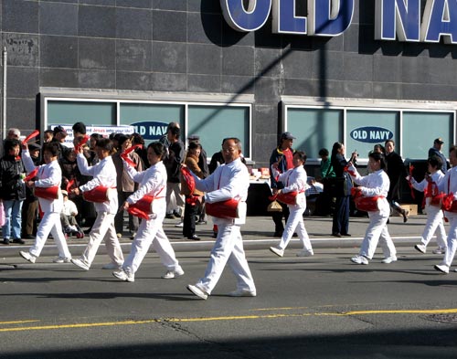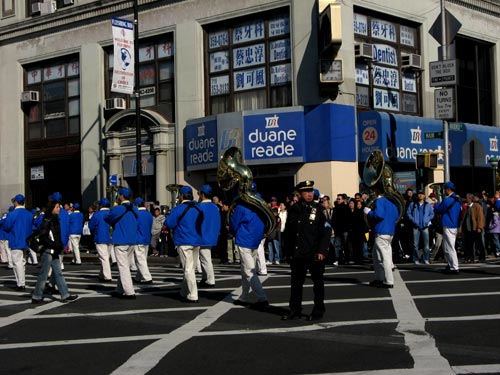 I emerged from the subway station to find Main Street blocked off to vehicular traffic from the Flushing Public Library to the Flushing Mall. Dancing lions led the charge, followed by marching musicians and Falun Dafa practitioners dressed in blue and white outfits. Participants in the parade held banners with the words “Supporting 15 million brave people who have quit the CCP,” “Only without the CCP can there be a new China,” and “Quit the Party to be safe.”