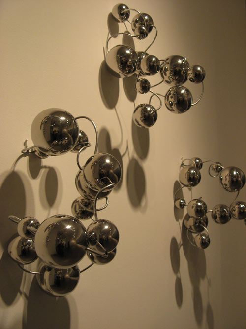 Kusama’s works all share an obsession with repetition and pattern, which she claims are inspired by hallucinations of dots, nets and flowers she experienced as a child. At the gallery talk, the curator offered some additional background on the artist: Kusama, now in her mid-70s, arrived in New York from Japan in 1958 and quickly established herself among the city’s avant-gardists, and an important precursor for Minimalism and the Body Art movement. Her works then also included books, photo collages, film and performance art–even landing her on the front page of the Daily News in August 1969 after she, along with a bunch of naked co-conspirators, infiltrated the Museum of Modern Art’s sculpture garden to perform her “Grand Orgy to Awaken the Dead.” Yoko Ono was among her devotees; she rivaled Andy Warhol on the quirky pop art scene. Despite this, she never quite achieved long-term critical or financial support. She returned to Tokyo in 1972.